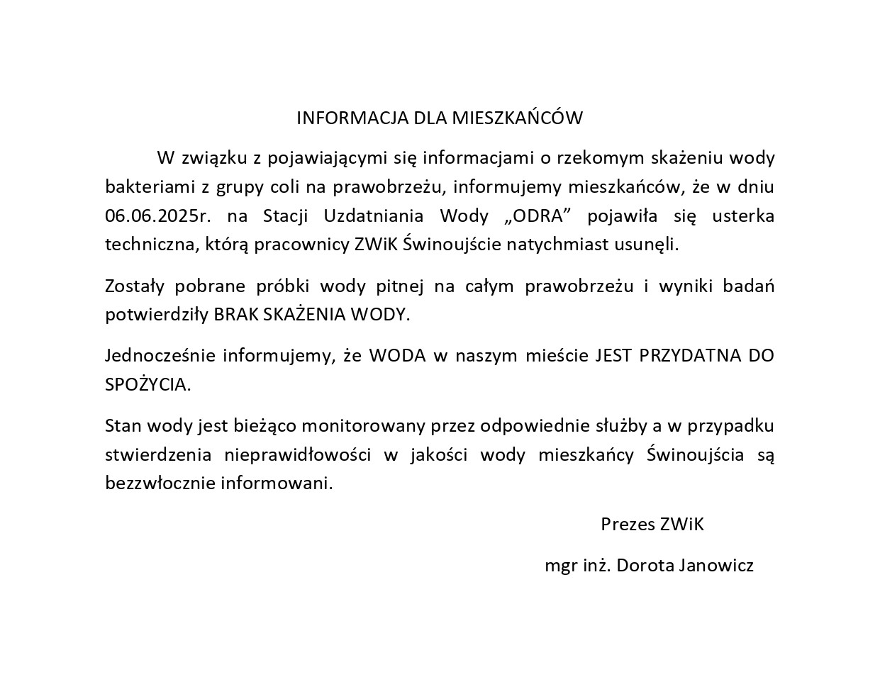 W związku z wykryciem zanieczyszczenia wody w dniu 17.09.2025 informujemy, że po podjęciu natychmiastowych działań mających na celu rozwiąznie problemu w dzielnicy Przytór-Łunowo oraz przeprowadzeniu niezbędnych badań próbek wody, Państwowy Powiatowy Inspektor Sanitarny w Świnoujściu stwierdził przydatnośćwody do spożycia przez ludzi w wodociągu...